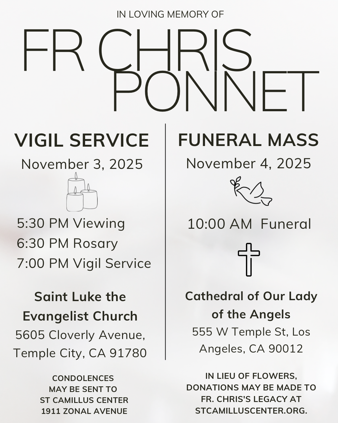 As we mourn his loss, we also celebrate his remarkable life and the profound impact he made. We invite all who were touched by his ministry to join us in honoring his memory by contributing to St. Camillus Center for Spiritual Care, carrying forward his vision, and keeping his legacy alive through acts of faith, service, and compassion.